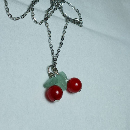 گردنبند زنانه سنگ مرجان قرمز با سنگ عقیق سبز اصل مدل گیلاس نقره‌ای استیل