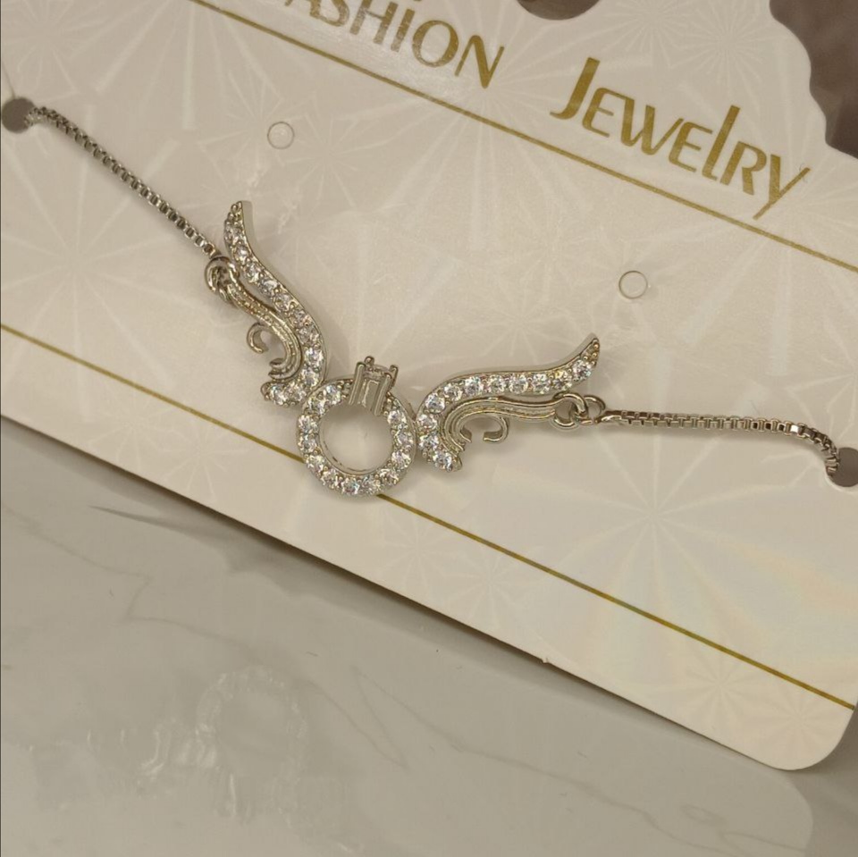 دستبند زنانه طرح بال و انگشتر رنگ نقره ای نگین دار جنس استیل با کیفیت ضد حساسیت و رنگ ثابت