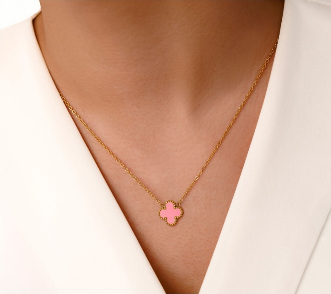 گردنبند زنانه طرح ونکلیف رنگ طلایی با گل صورتی فوقالعاده طراحی شیک و تک از روی برند