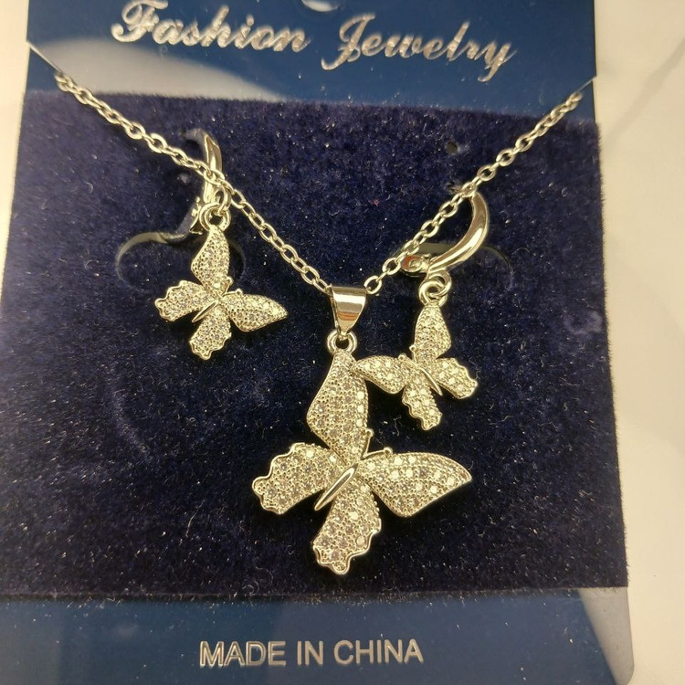 نیم ست زنانه طرح پروانه رنگ نقره ای جواهر نشان نگین دار: جنس استیل با کیفیت ضد حساسیت و رنگ ثابت
