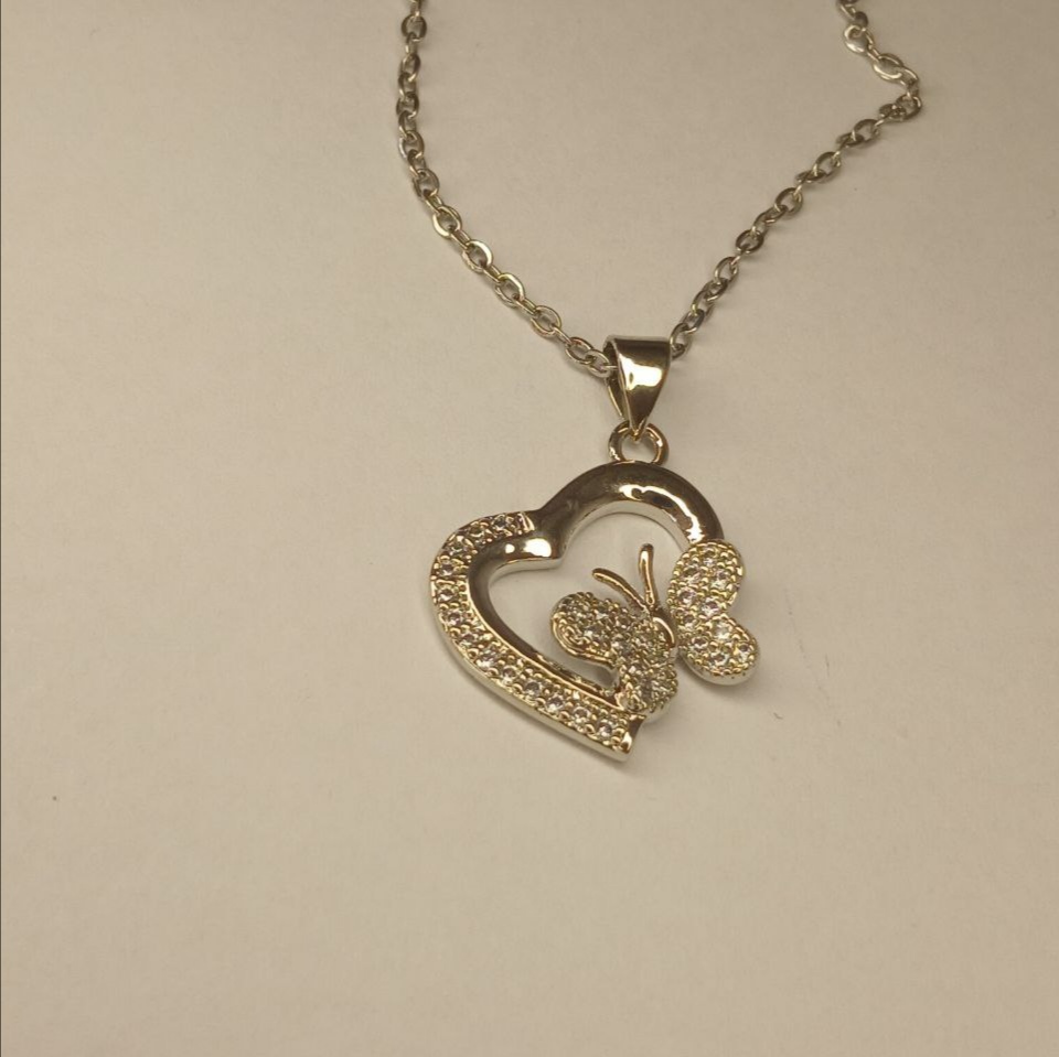 گردنبند مدل قلب و پروانه رنگ نقره ای جنس استیل با کیفیت ضد حساسیت و رنگ ثابت متریال درجه 1