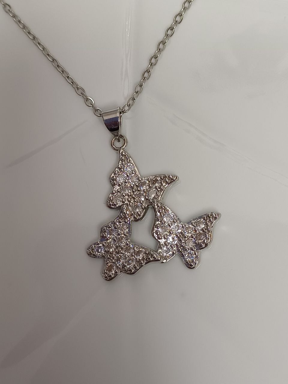 گردنبند مدل 3 پروانه رنگ نقره ای نگین دار کریستالی: جنس استیل با کیفیت ضد حساسیت و رنگ ثابت
