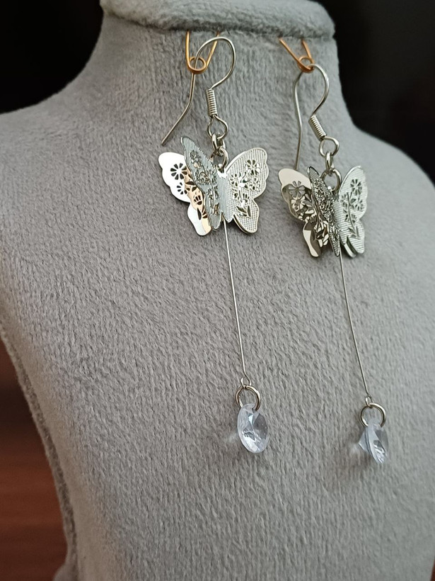 گوشواره آویزی طرح پروانه نگین دار رنگ نقره ای: جنس استیل با کیفیت ضد حساسیت و رنگ ثابت متریال درجه 1 بادوام باهاش برو استخر مادامالعمر استفاده کن