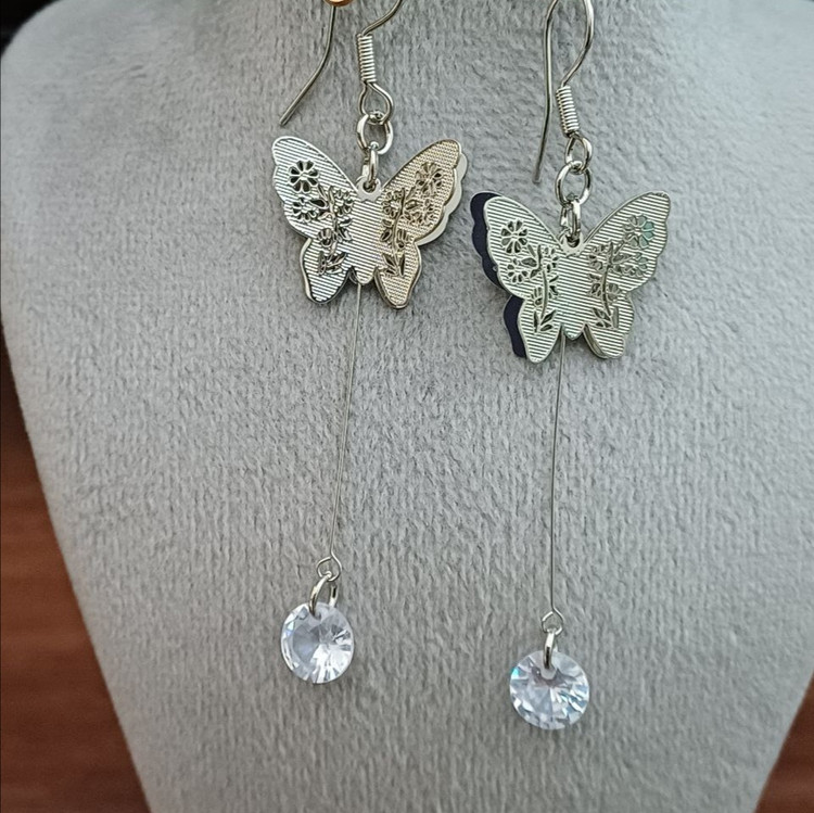 گوشواره آویزی طرح پروانه نگین دار رنگ نقره ای جنس استیل با کیفیت ضد حساسیت و رنگ ثابت متریال درجه 1 بادوام باهاش برو استخر مادامالعمر استفاده کن