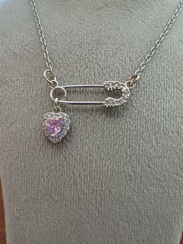گردنبند زنانه مدل سنجاق و قلب صورتی رنگ نقره ای نگین دار کریستالی: جنس استیل با کیفیت ضد حساسیت و رنگ ثابت متریال درجه 1