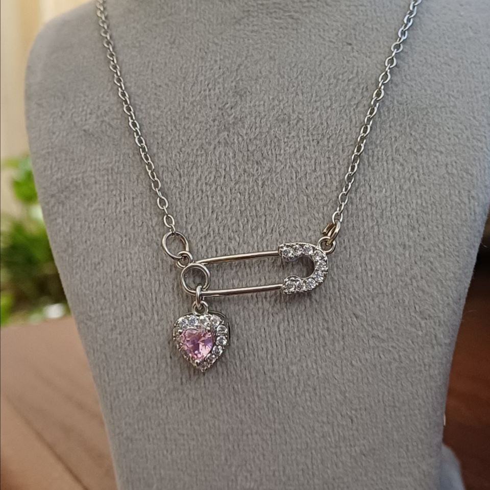 گردنبند زنانه مدل سنجاق و قلب صورتی رنگ نقره ای نگین دار کریستالی: جنس استیل با کیفیت ضد حساسیت و رنگ ثابت متریال درجه 1