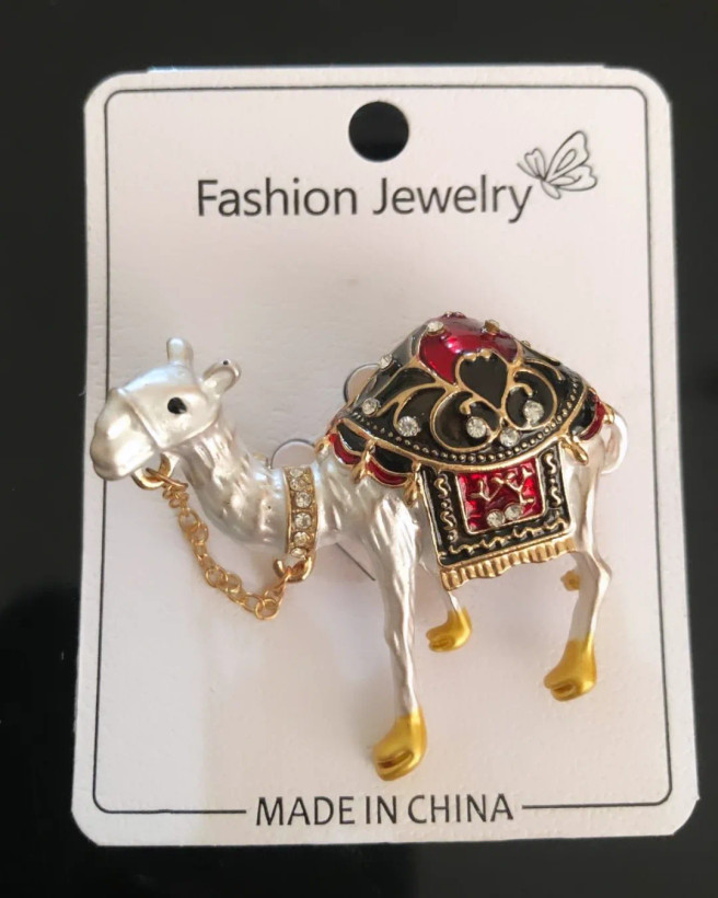 گل سینه مدل شتر ترکیب رنگ سفید و طلایی: جنس استیل با کیفیت نگین دار ضد حساسیت و رنگ ثابت شیک و سبک ظریف و براق