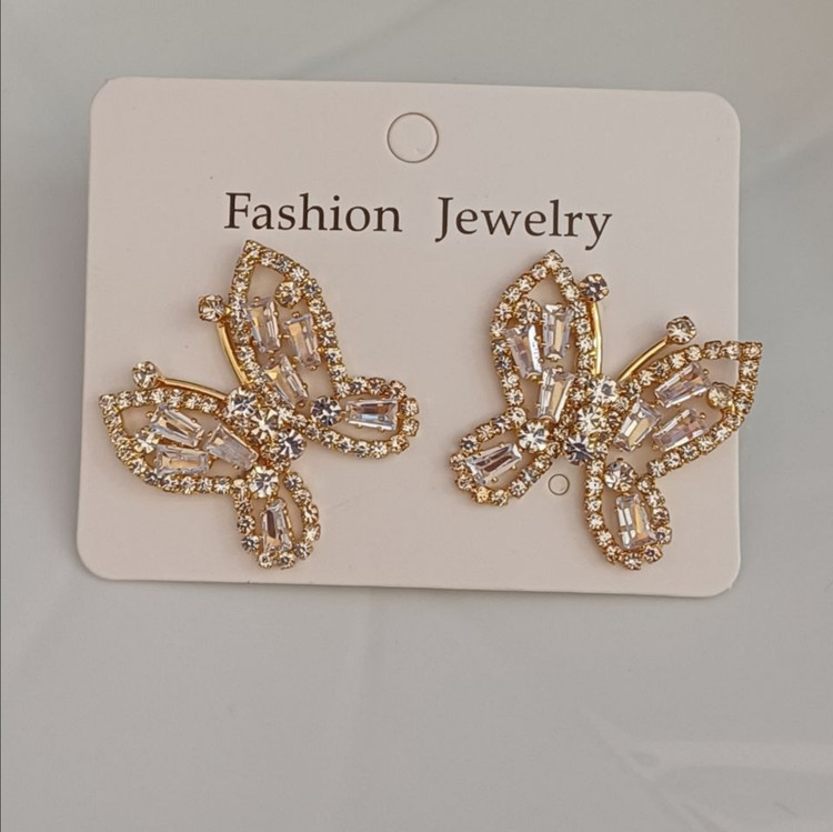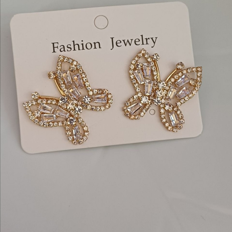 گوشواره زنانه مدل پروانه طرح جواهر نشان رنگ طلایی: جنس استیل با کیفیت ضد حساسیت و رنگ ثابت متریال درجه 1 بادوام مادامالعمر استفاده کن