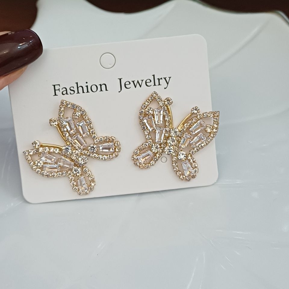 گوشواره زنانه مدل پروانه طرح جواهر نشان رنگ طلایی: جنس استیل با کیفیت ضد حساسیت و رنگ ثابت متریال درجه 1 بادوام مادامالعمر استفاده کن