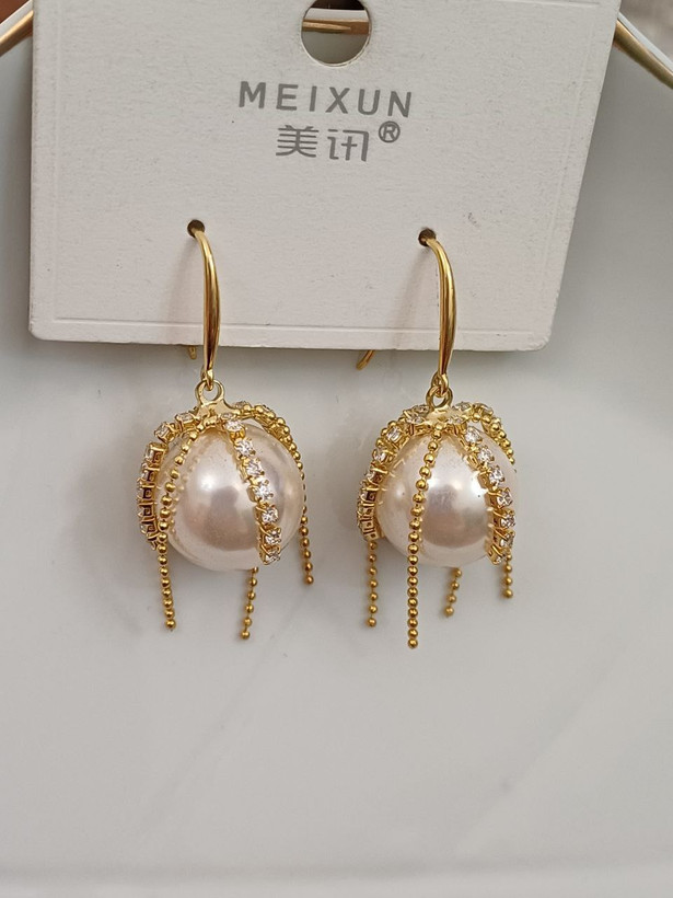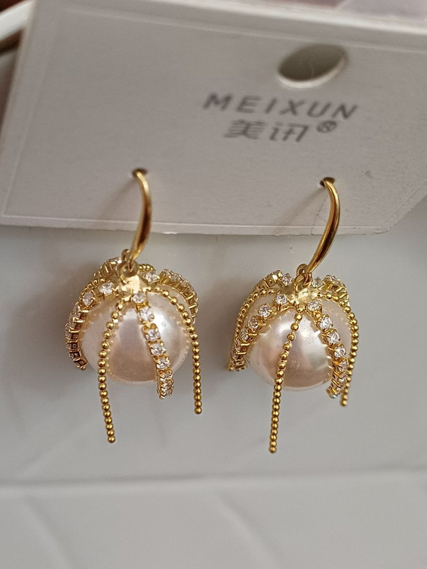 گوشواره زنانه مدل مروارید نگین دار کریستالی رنگ طلایی جنس استیل با کیفیت ضد حساسیت و رنگ ثابت متریال درجه 1 بادوام مادامالعمر استفاده