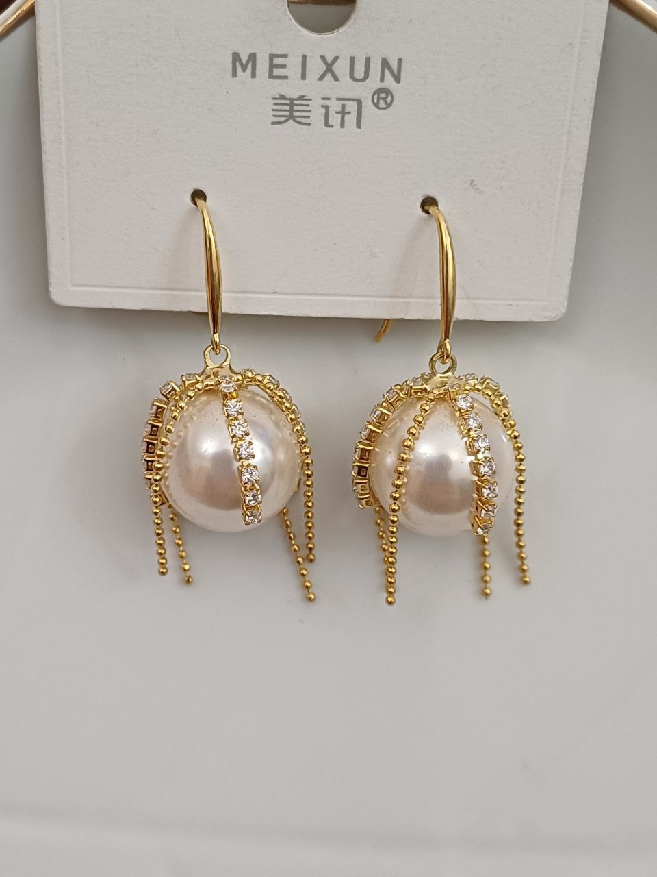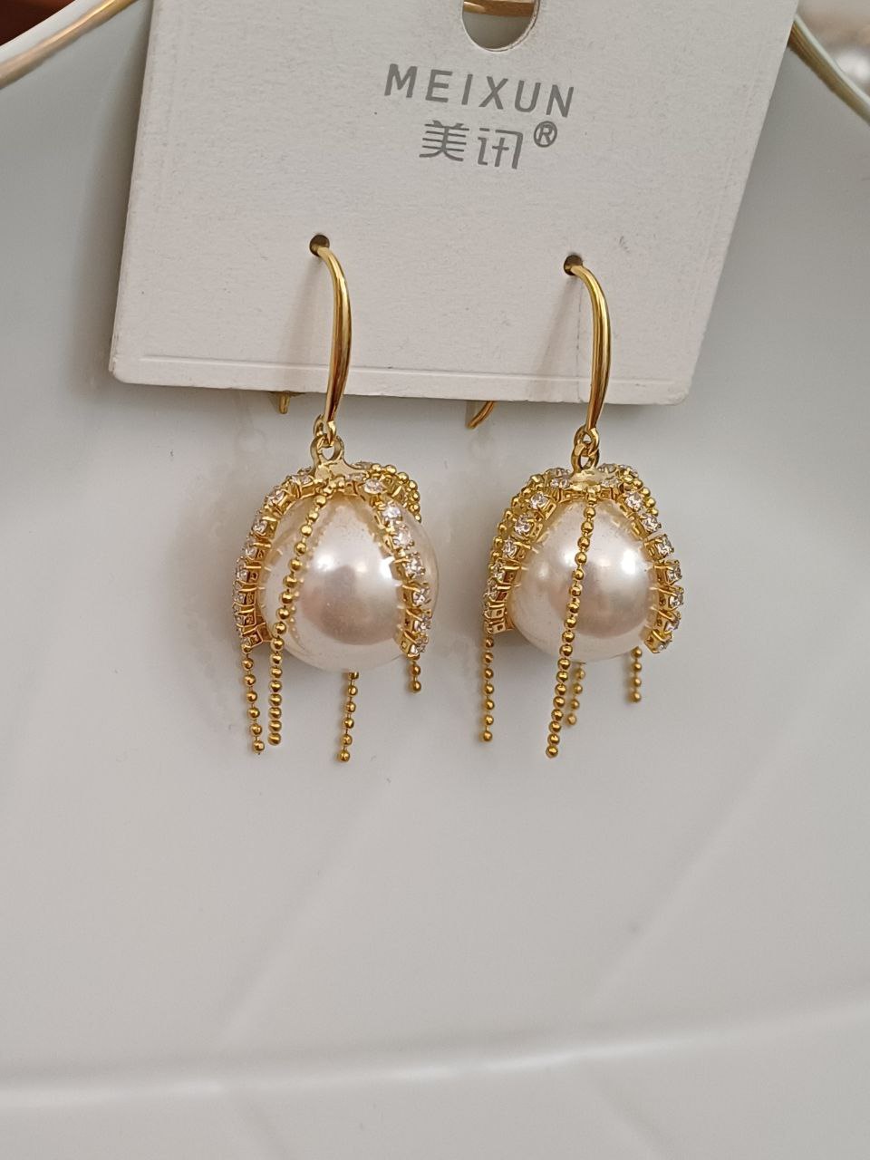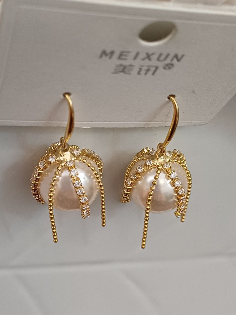 گوشواره زنانه مدل مروارید نگین دار کریستالی رنگ طلایی جنس استیل با کیفیت ضد حساسیت و رنگ ثابت متریال درجه 1 بادوام مادامالعمر استفاده