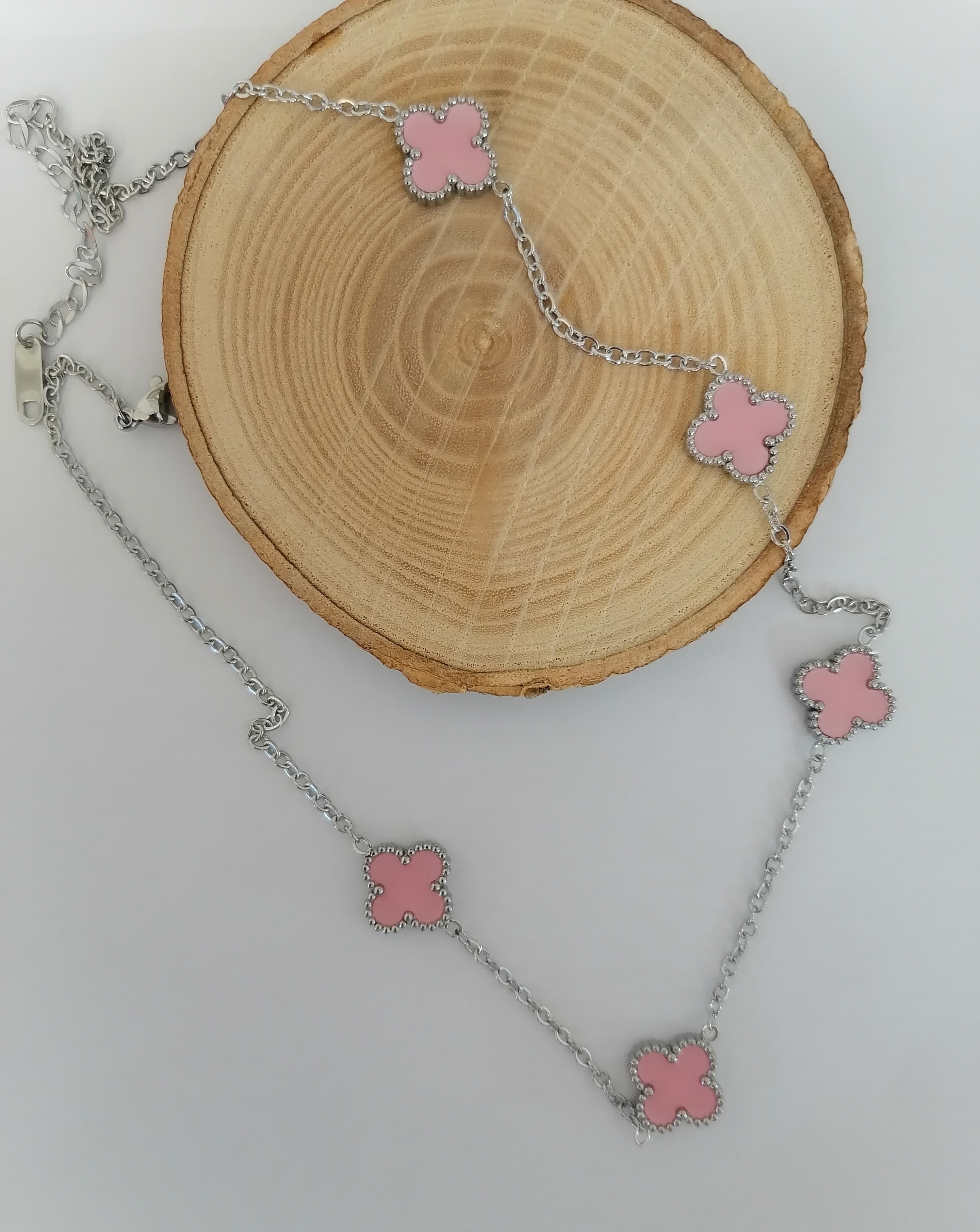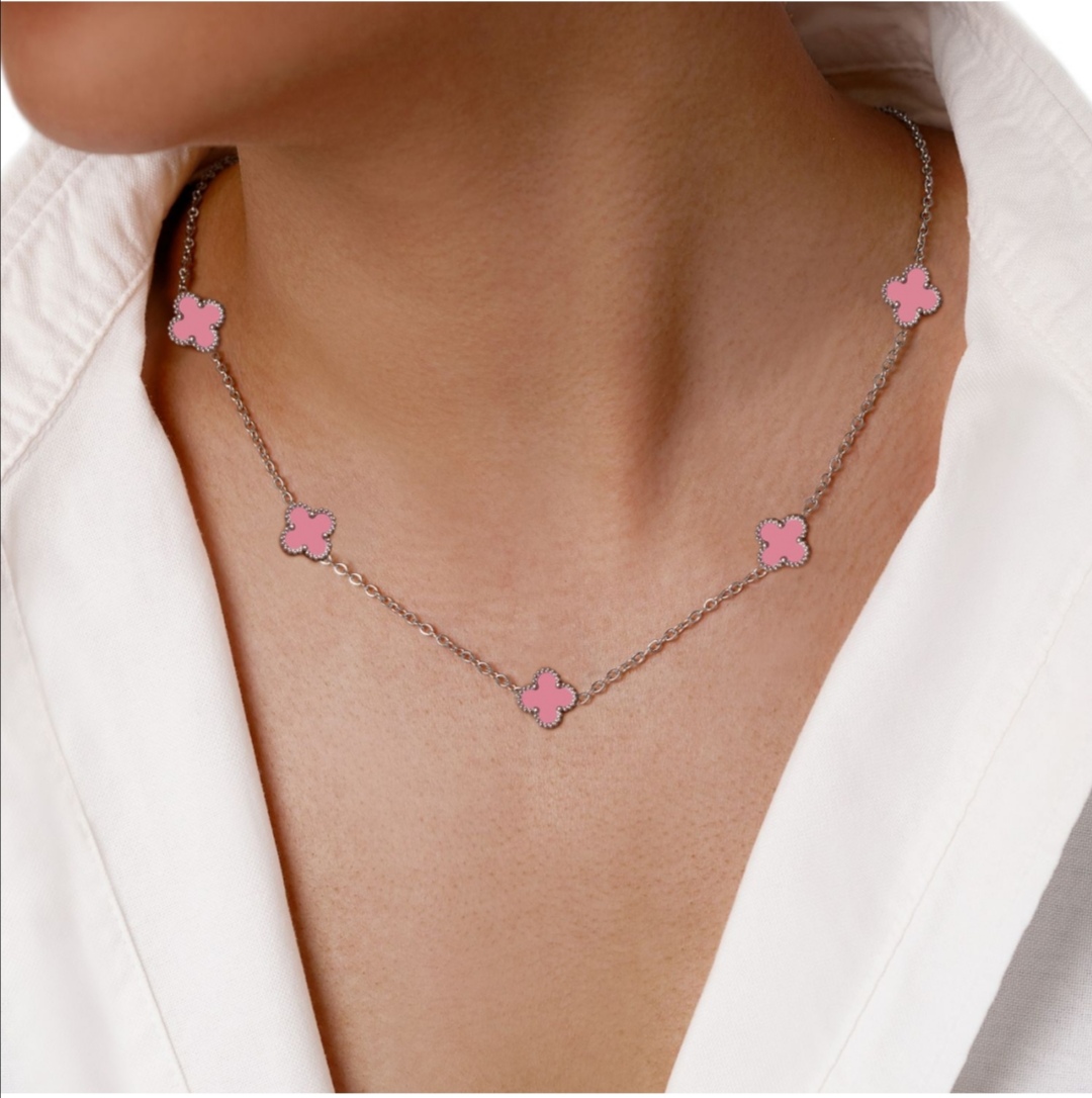 گردنبند زنانه ونکلیف مدل 5گل رنگ صورتی رنگ زنجیر نقرهای: جنس استیل با کیفیت ضد حساسیت و رنگ ثابت شیک و سبک ظریف و براق