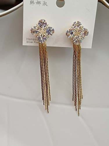 گوشواره زنانه مدل آویزی بلند نگین دار کریستالی طلایی استیل ضد حساسیت مادامالعمر استفاده کن
